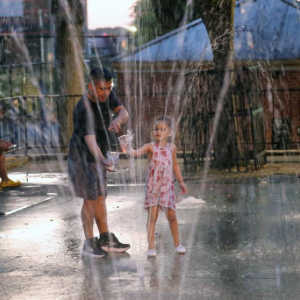 6月24日,人们在美国纽约皇后区一处喷泉戏水消暑。