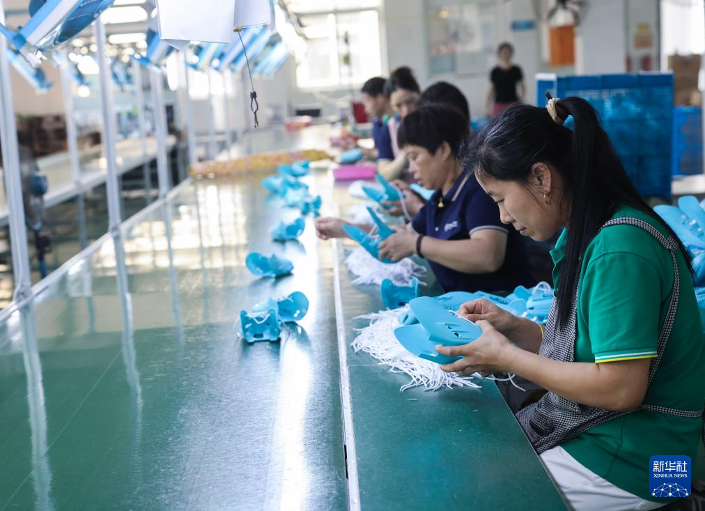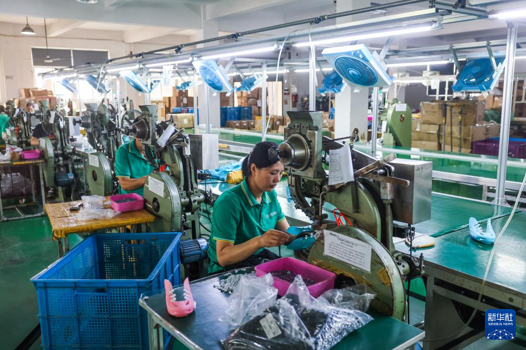 6月25日,工人在宁波金峰文体器材有限公司车间内加工出口的轮滑鞋。