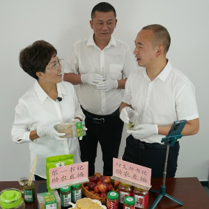 6月24日,在安康市岚皋县孟石岭镇电商直播基地,岚皋县滔河镇同心村第一书记王超(前左一)、岚皋县民主镇明珠社区第一书记张尧(前右一)与电商主播一起直播,帮助当地群众销售农特产品。
