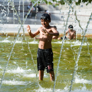 6月29日,小男孩在西班牙马德里的公园喷泉里戏水。