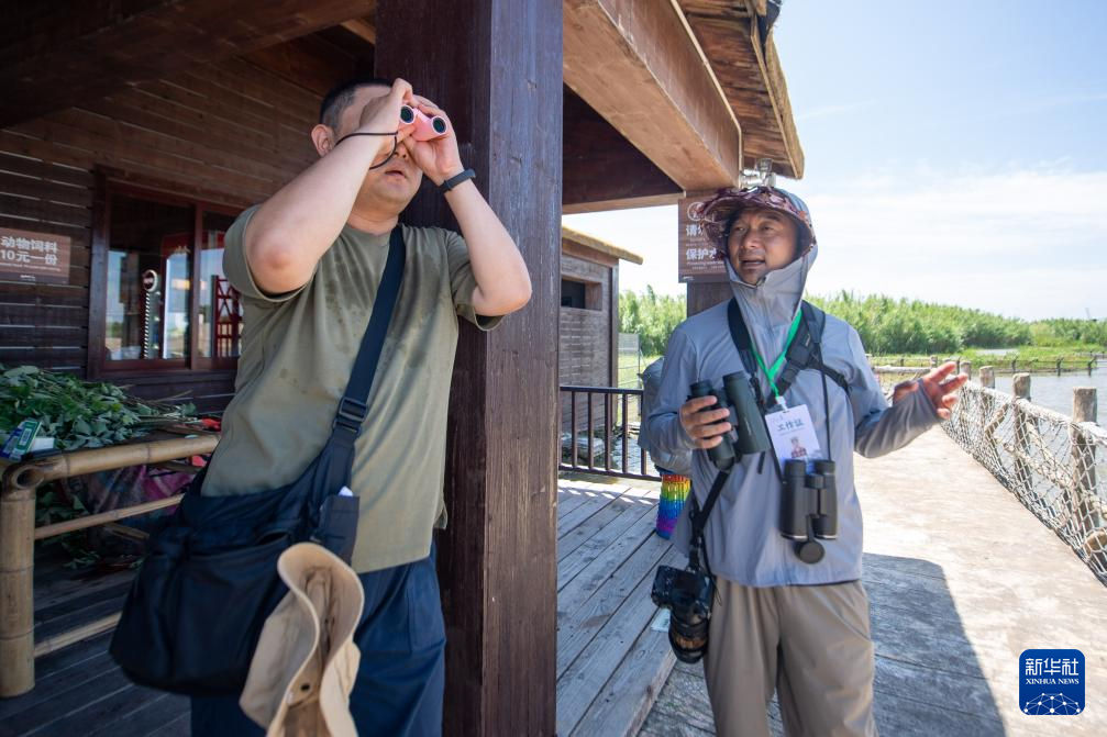 7月5日,观鸟志愿者胡勇(右)在杭州湾国家湿地公园内一处观鸟点为游客讲解。