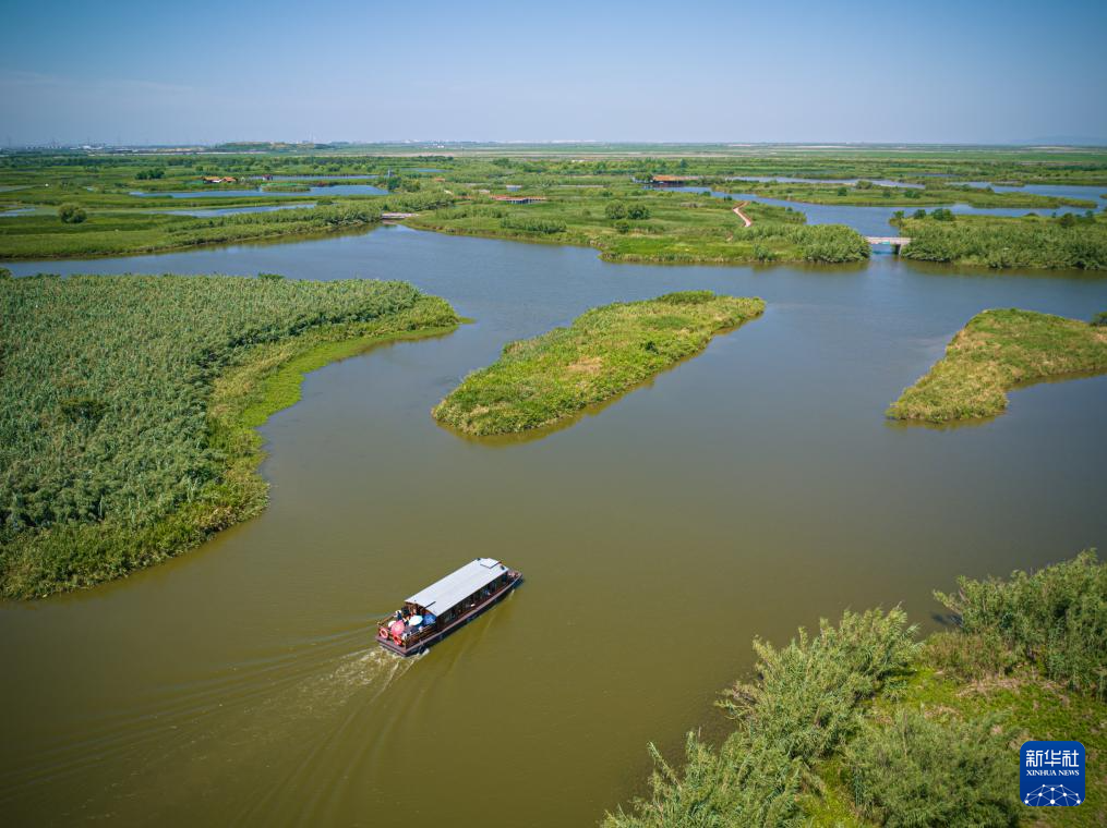 7月5日,游客乘船进入杭州湾国家湿地公园观鸟(无人机照片)。