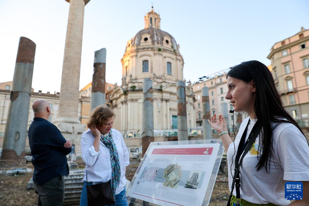 7月5日傍晚,在意大利罗马,讲解员在古罗马广场为游客讲解。