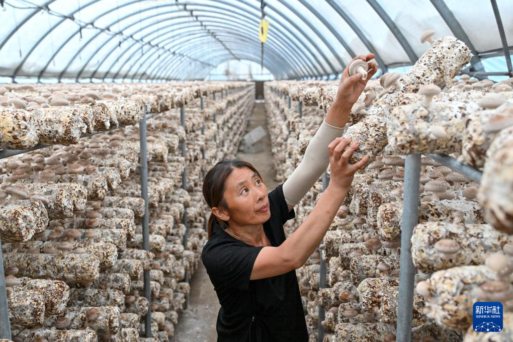 7月4日,阜平县天生桥镇食用菌产业核心园区的工作人员在大棚内摘香菇。