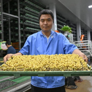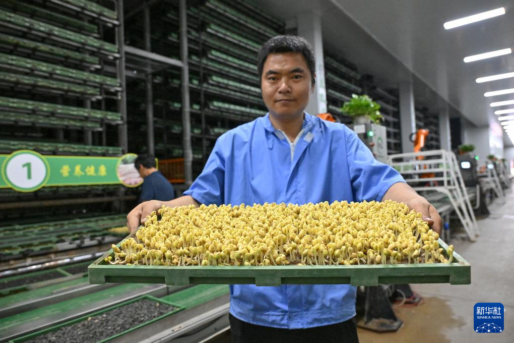 7月4日,河北省阜平县豆致富土培芽苗菜植物工厂,工作人员展示土培黄豆芽。
