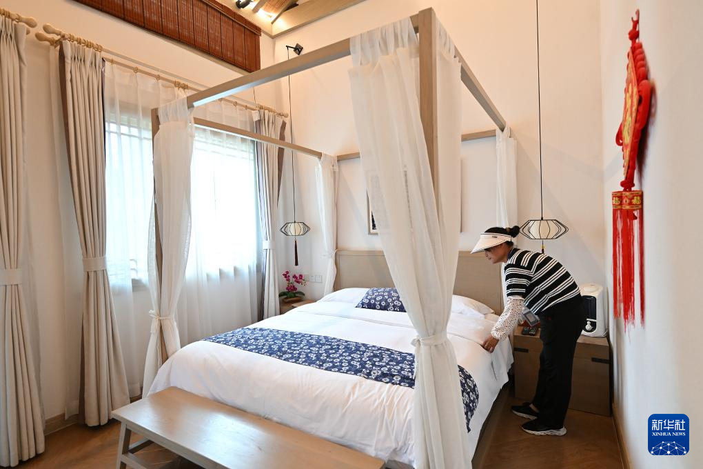 7月4日,阜平县骆驼湾村精品民宿的工作人员在整理房间。