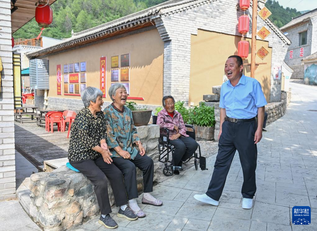7月4日,阜平县骆驼湾村党支部书记顾瑞利(右一)与乘凉的村民拉家常。