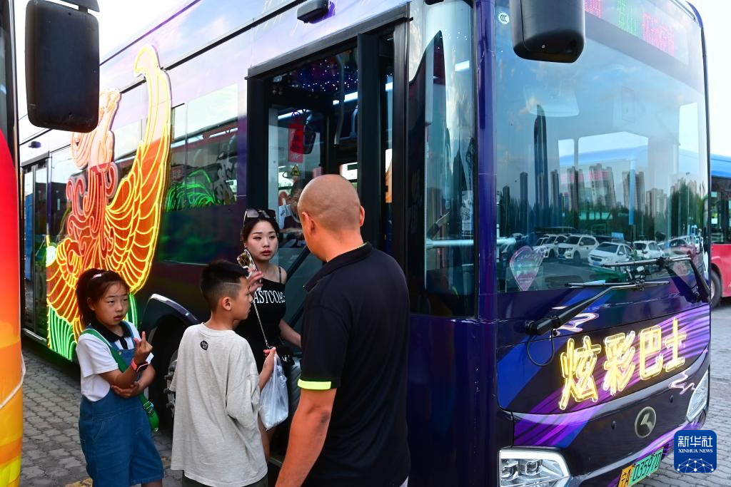 7月8日,乘客在览山公园停车场乘坐“炫彩巴士” 。