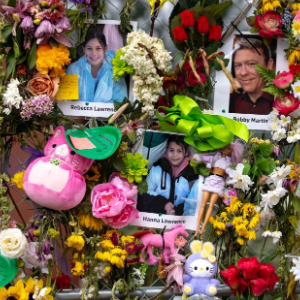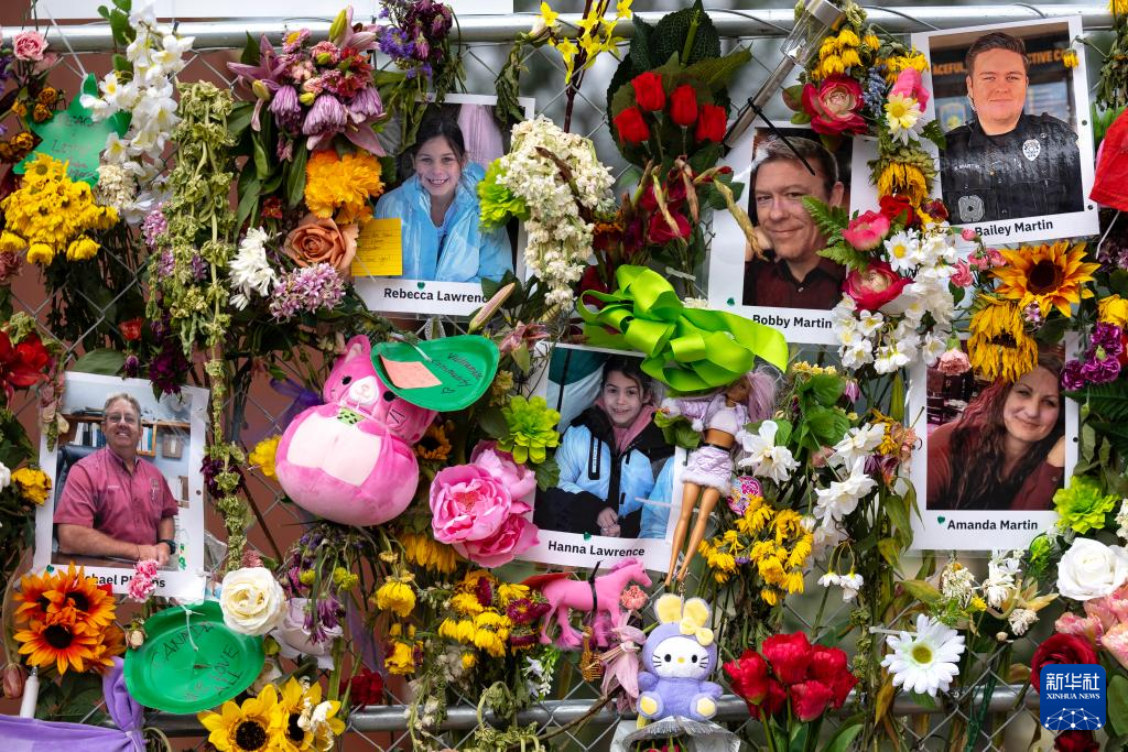 7月12日,在美国得克萨斯州克尔维尔,人们将悼念的鲜花插在洪灾遇难者的照片旁。
