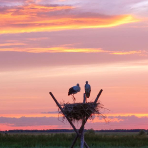 7月13日,在夕阳下的黑龙江三环泡国家级自然保护区,东方白鹳在人工巢中活动(无人机照片)。