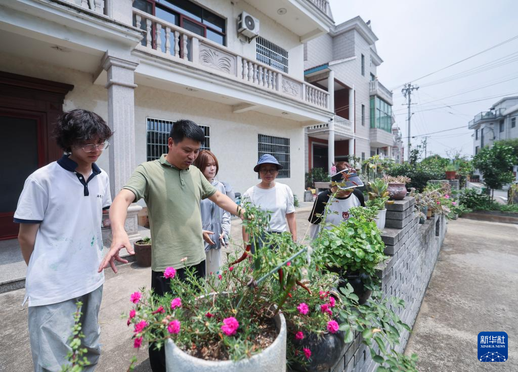 7月15日,在诸暨市安华镇丰江周村,浙江农林大学暨阳学院设计专业的学生们创作墙绘,美化乡村人居环境。
