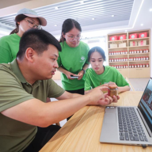 7月15日,在诸暨市安华镇丰江周村共富工坊内,绍兴市文化特派员陈航峰(左一)带领浙江农林大学暨阳学院设计专业的学生一起探讨提升当地红糖礼盒的包装设计。2024年陈航峰带领学生设计了丰江周村共富工坊的第一版红糖礼盒包装,这次根据市场的反馈他们继续提升改进设计包装。