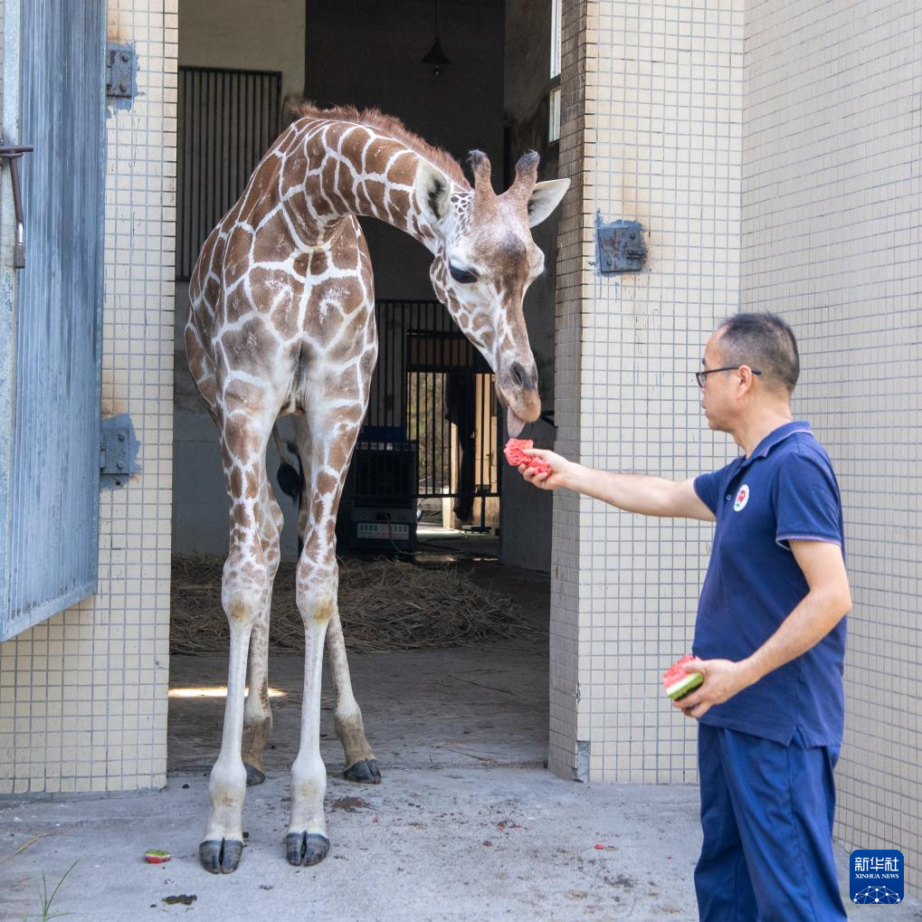 7月16日,饲养员在重庆动物园给长颈鹿喂食冰镇西瓜。