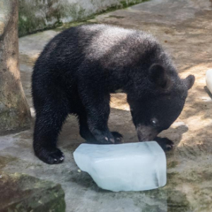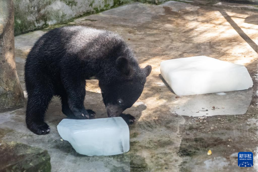 7月16日,亚洲黑熊在重庆动物园玩冰消暑。