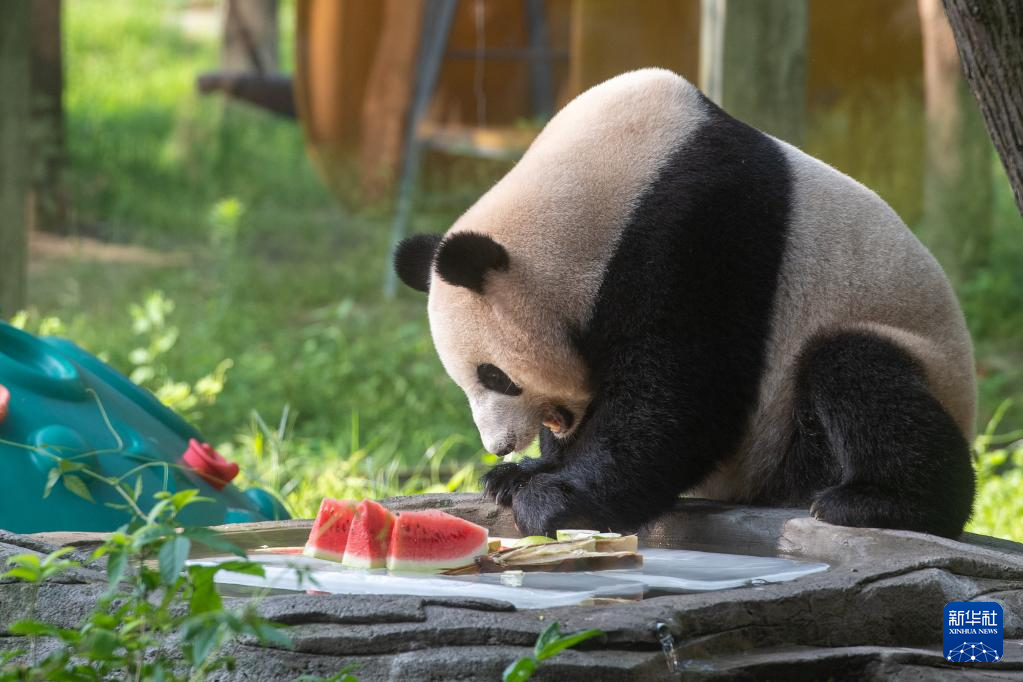 7月16日,大熊猫在重庆动物园吃冰镇水果。
