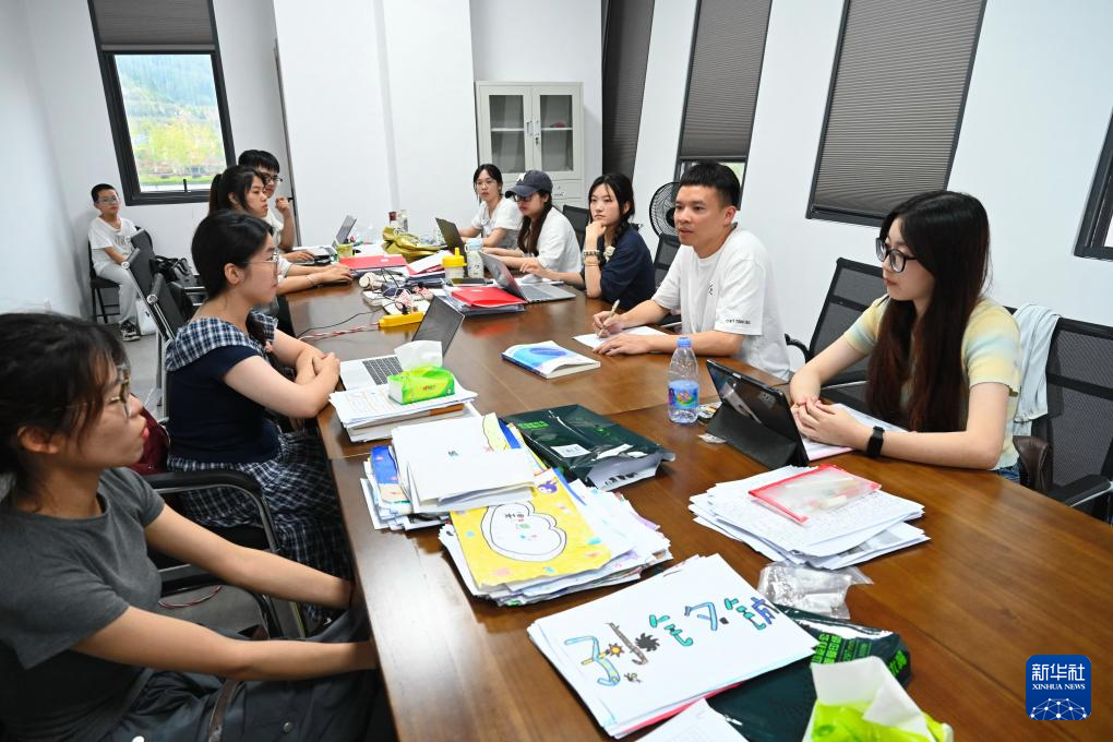 7月16日,胡廷枫(右二)与志愿者教师开展志愿服务经验交流。