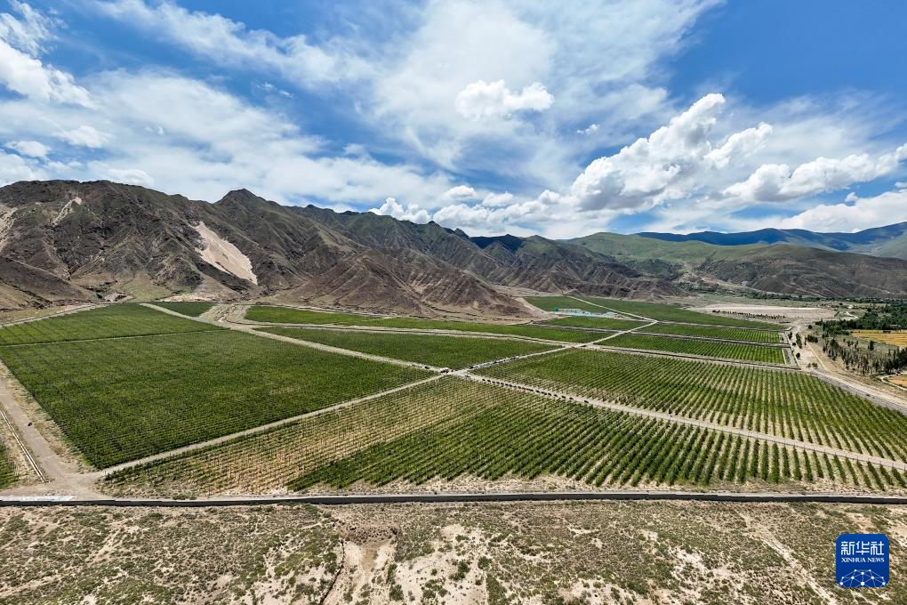 这是西藏扎囊县的一处矮化苹果种植园区,采用现代农业滴灌技术,使水资源得到高效利用,还可以用果树防风固沙,让沙化地变绿洲(无人机照片,7月19日摄)。