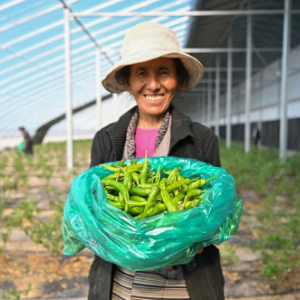 7月19日,西藏扎囊县绿之源现代农业科技股份有限公司的员工次旺拉吉展示刚采摘下来的有机辣椒。