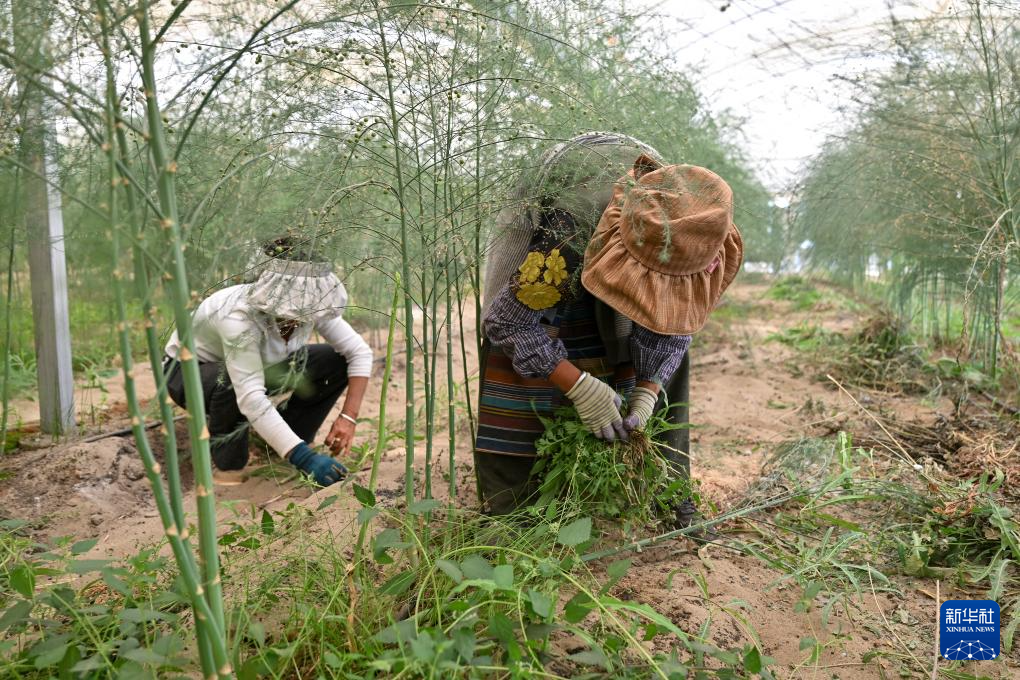 7月19日,西藏扎囊县绿之源现代农业科技股份有限公司的员工在有机芦笋大棚内手工除草。