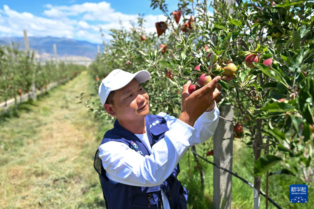 7月19日,西藏扎囊县的矮化苹果种植园区的工作人员查看苹果长势。