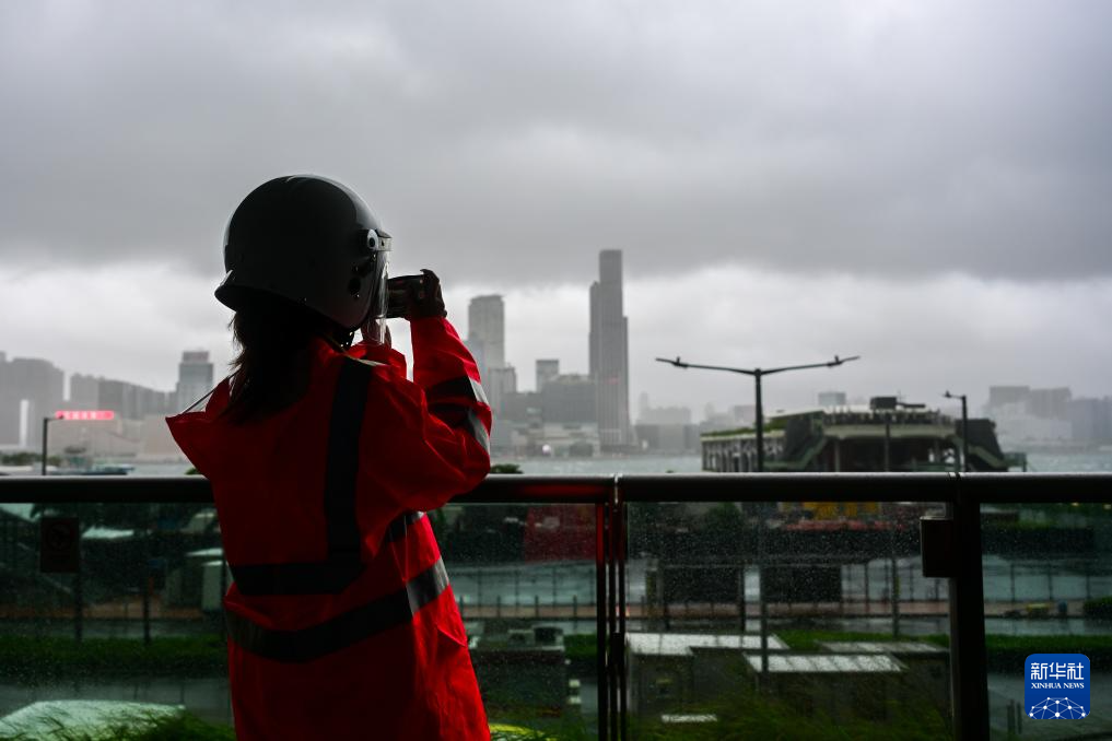7月20日,一名港铁工作人员在香港维多利亚港关注风势。