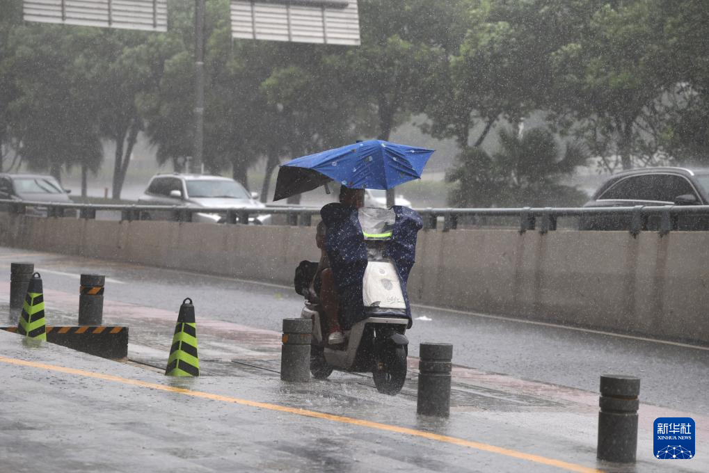 7月20日,在广东省深圳市泥岗东路,一名市民在风雨中骑车前行。