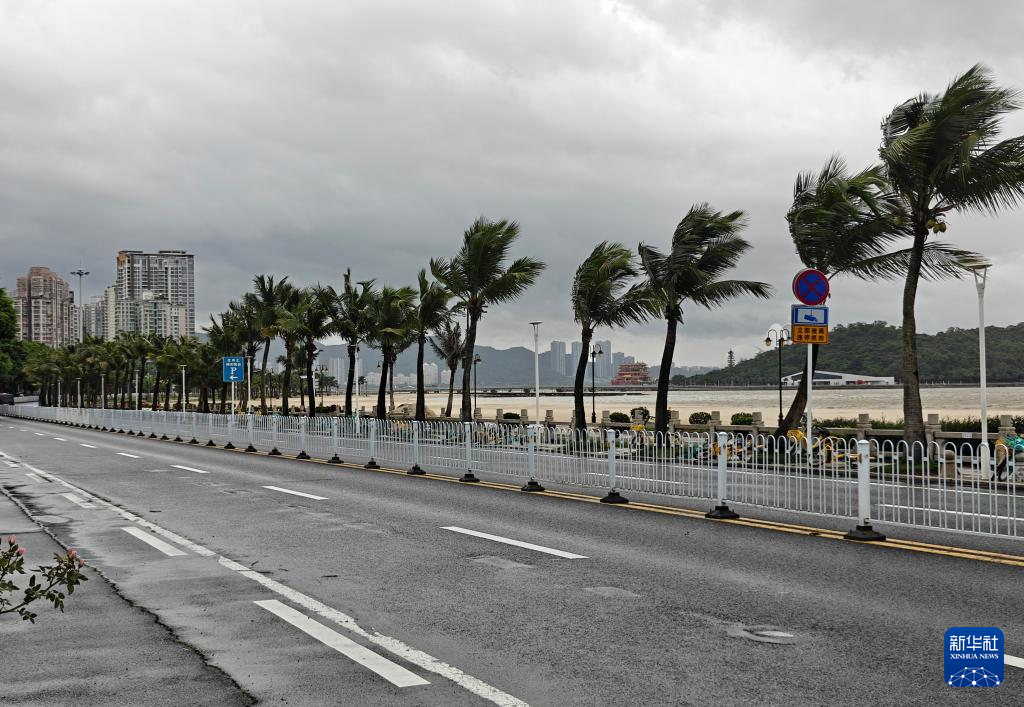 7月20日,在广东省珠海市情侣路,树木在大风中倾斜晃动。