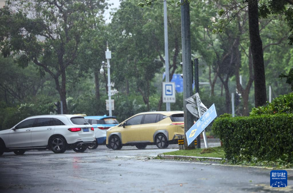 7月20日,在深圳市南山区,车辆经过倒塌的道路指示牌。