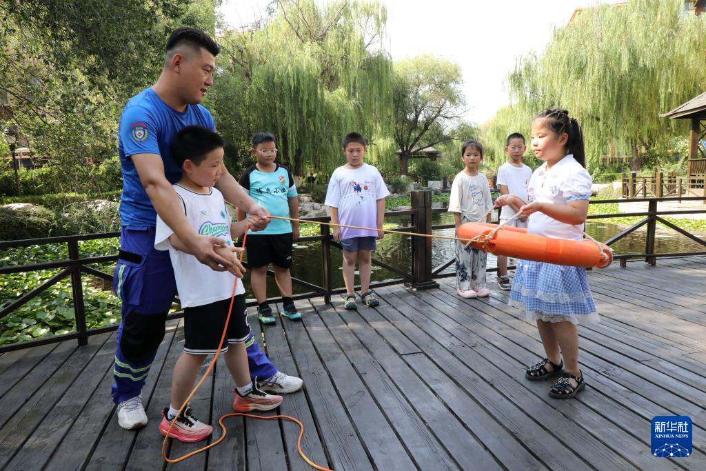 7月25日,在山东省滨州市博兴县城东街道东城社区,博兴县“9958”应急救援队志愿者指导小朋友使用救生圈演练溺水自救互救基本技能。