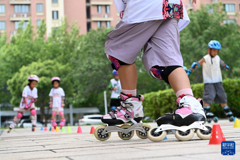 7月26日,孩子们在河南省济源市世纪广场练习轮滑。