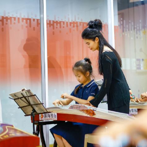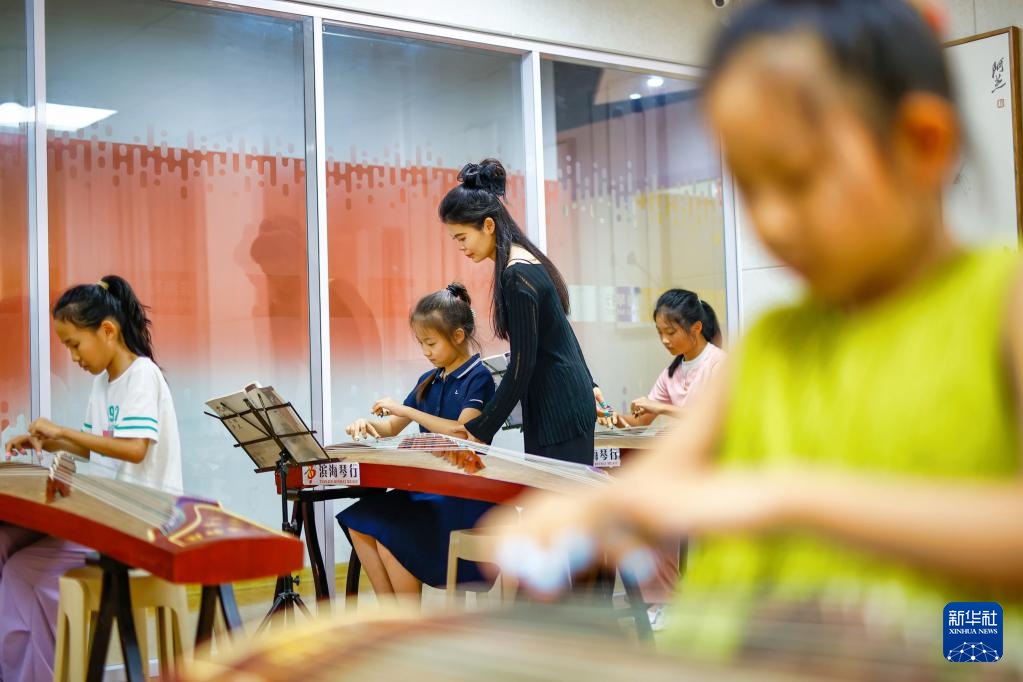 7月26日,在天津市滨海新区的滨海琴行内,小朋友学习古筝弹奏。