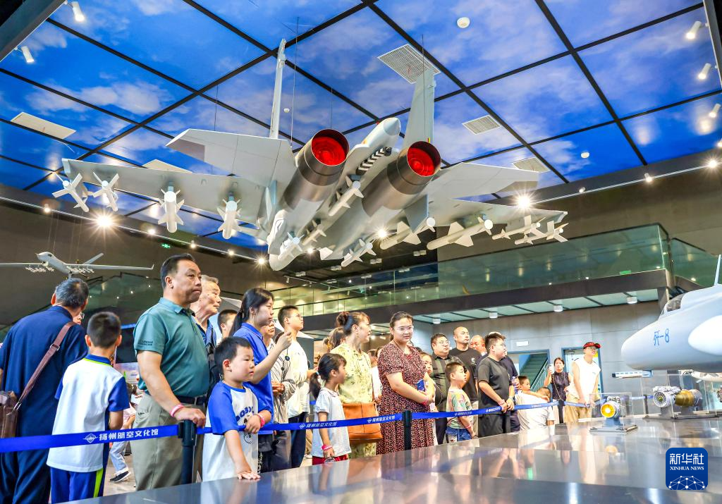 7月26日,家长带着孩子在江苏省扬州航空馆参观航空国防展。