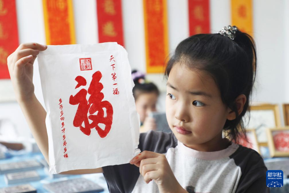 7月25日,在河北省唐山市丰润区燕山路街道欣园社区,小女孩展示自己的拓印作品。