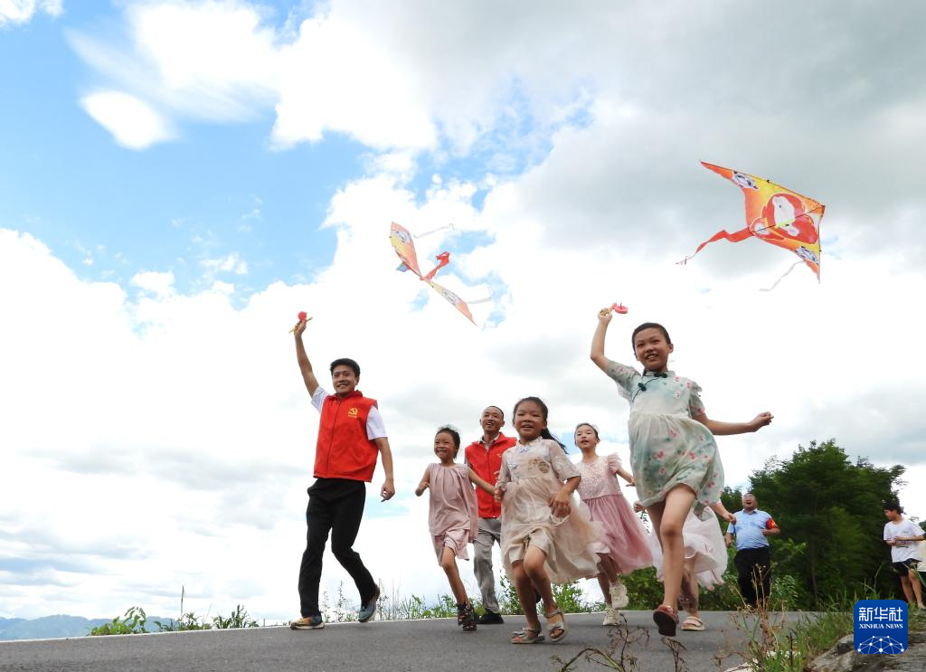 7月25日,在四川省达州市大竹县川主乡铁佛村,留守儿童和党员志愿者一起放风筝。