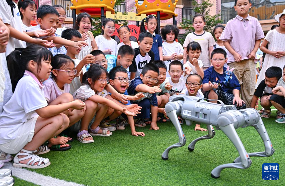 7月25日,在四川省眉山市仁寿县总工会开办的爱心托管班上,孩子们和机器狗互动。