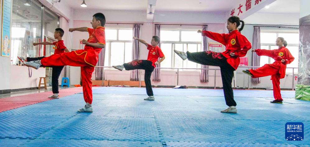 7月26日,小朋友在河北省遵化市一家武术培训学校练习武术基本功。