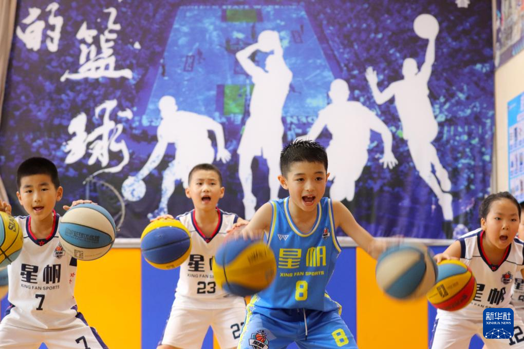 7月25日,在山东省高密市一篮球训练营,孩子们练习篮球基本功。