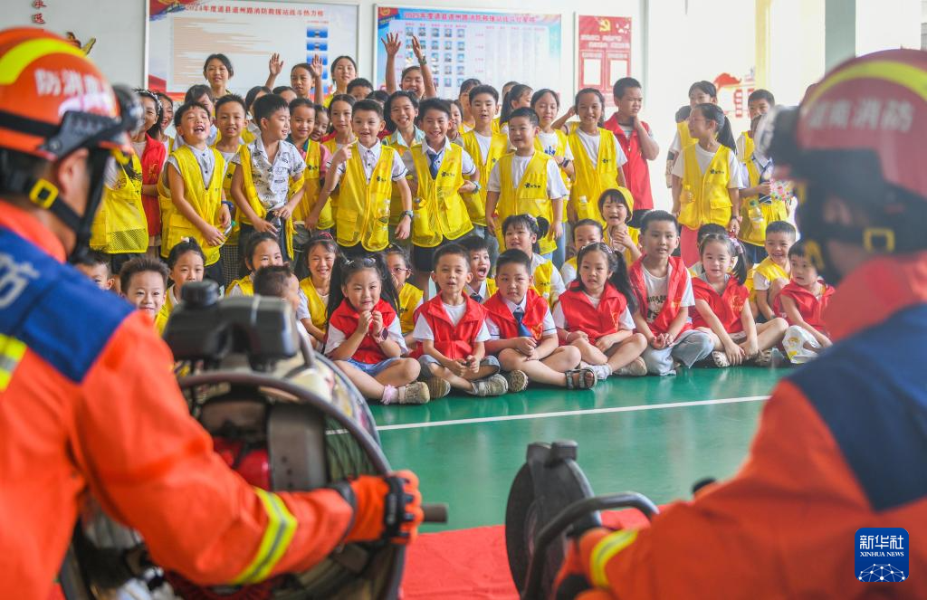 7月25日,在湖南省永州市道县消防救援大队,消防救援人员给孩子们普及消防器材使用知识。