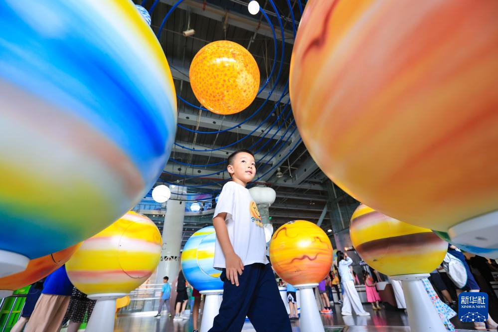 7月26日,小朋友在南京科技馆观看科普装置。
