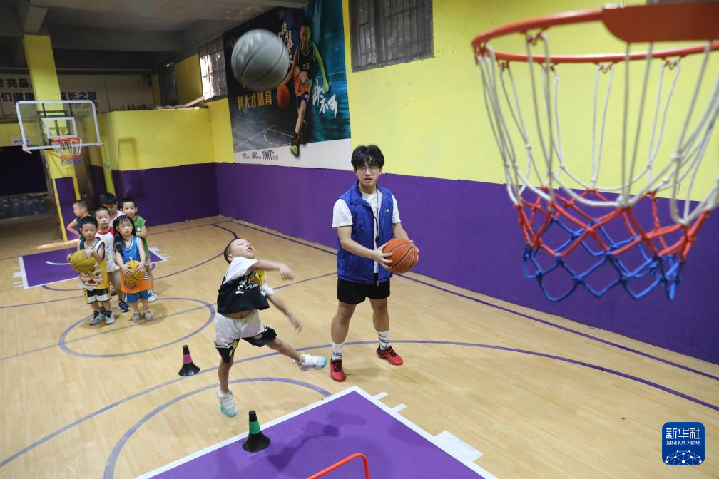 7月26日,小朋友在湖南省永州市道县一家篮球馆里练习投篮。