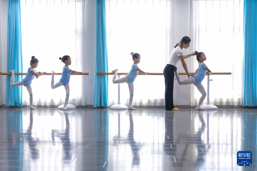 7月26日,在山东省青岛市城阳区城阳街道一家培训机构,老师指导孩子们练习舞蹈基本功。