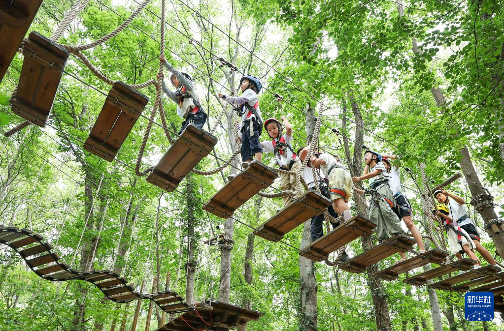 7月26日,孩子们在江苏连云港市枫树湾丛林乐园体验空中探险。