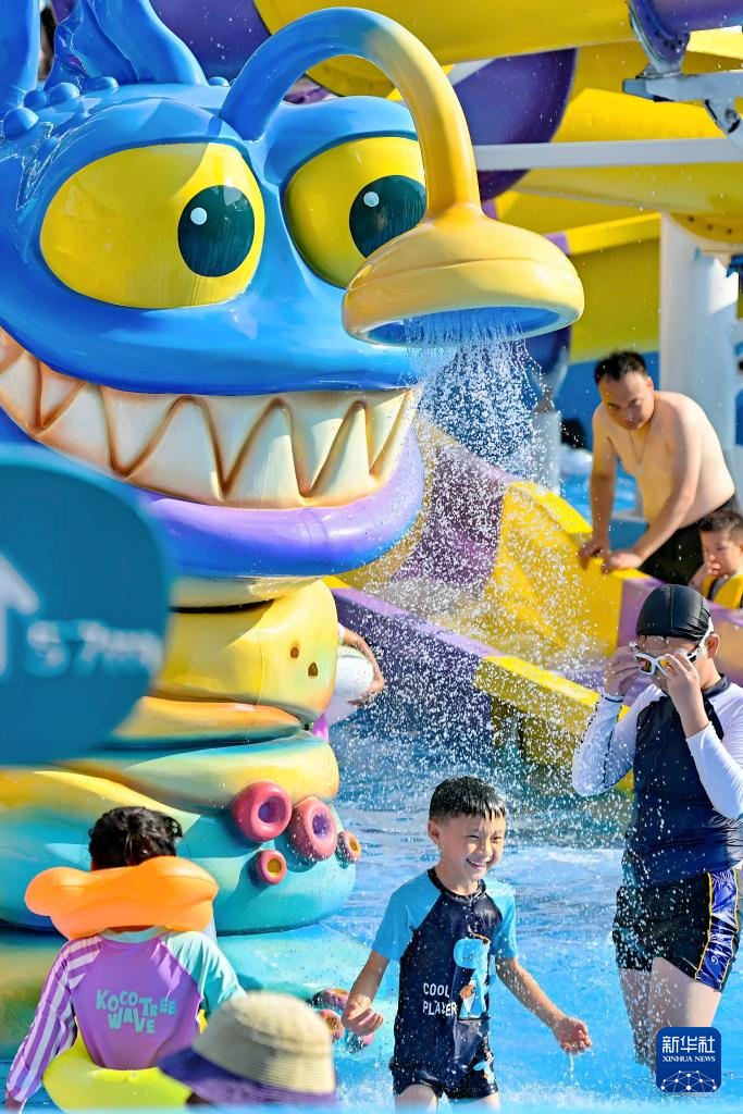 7月26日,孩子在天津市滨海新区极地海洋度假区戏水游玩。