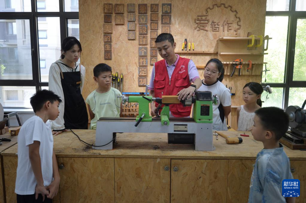 7月26日,在山东省青岛市城阳区夏庄街道华安路社区开展的暑期爱心辅导活动上,志愿者为小朋友们演示木工车床工作原理。
