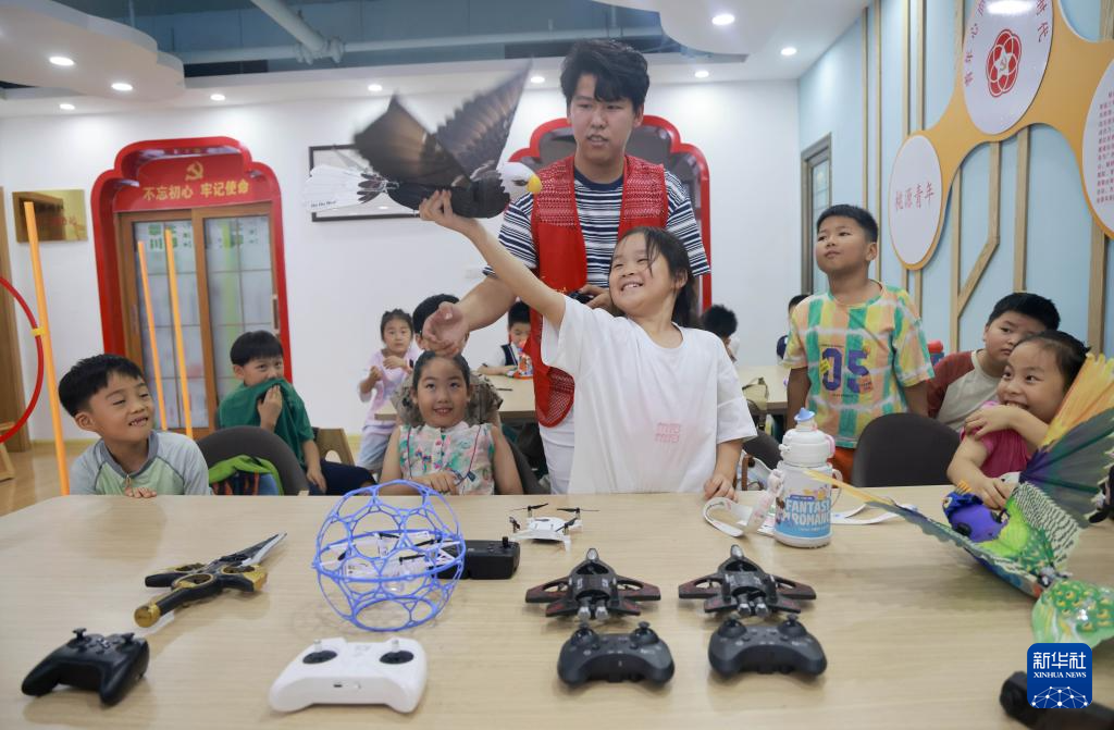 7月25日,在山东省临沂市兰山区银雀山街道桃源社区暑假托管班上,兰山区机器人协会的志愿者协助小朋友体验鹰造型的无人机。