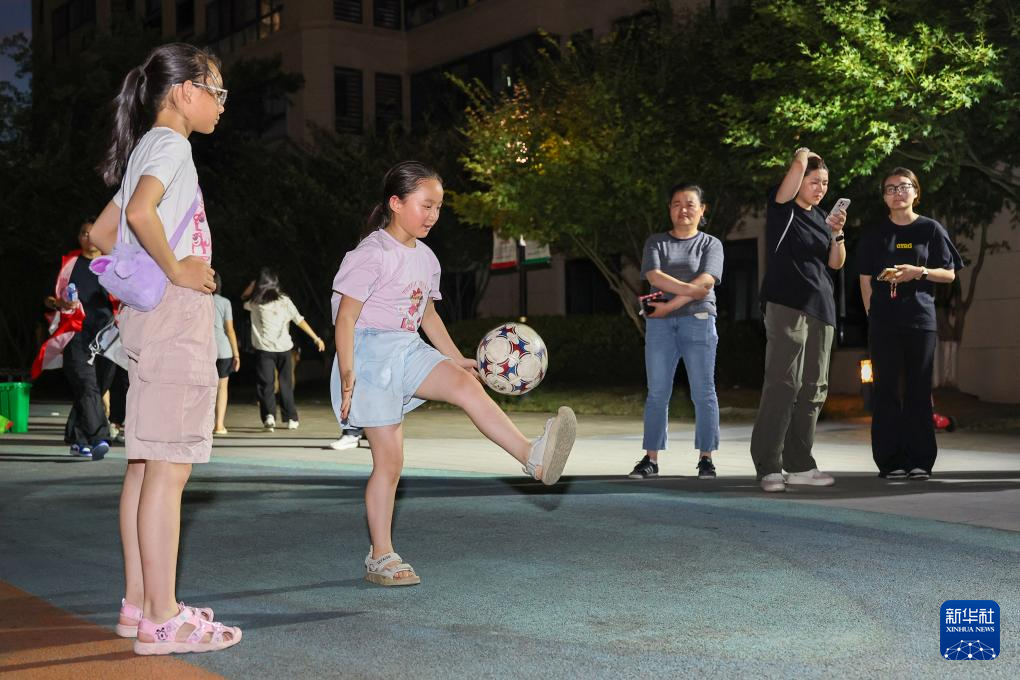7月25日晚,在江苏省无锡市梁溪区瞻江街道万融社区举办的消夏运动会上,小朋友参与颠足球比赛。