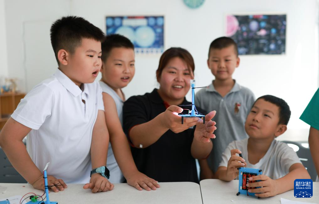 7月26日,在山东省东营市广饶县李鹊镇的一处萤火虫课堂,志愿者指导孩子们开展趣味科学小制作。