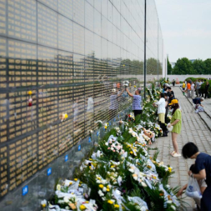 当日是唐山大地震49周年,市民来到河北唐山地震遗址纪念公园,在纪念墙前献上鲜花,缅怀地震罹难者。