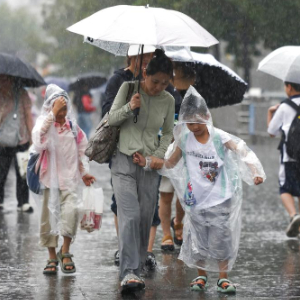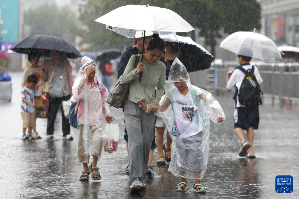 7月30日,旅客在上海站南广场冒雨前行。