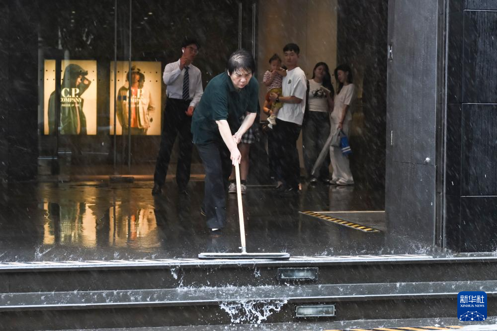 7月30日,工作人员在上海市静安区一地铁口清理积水。